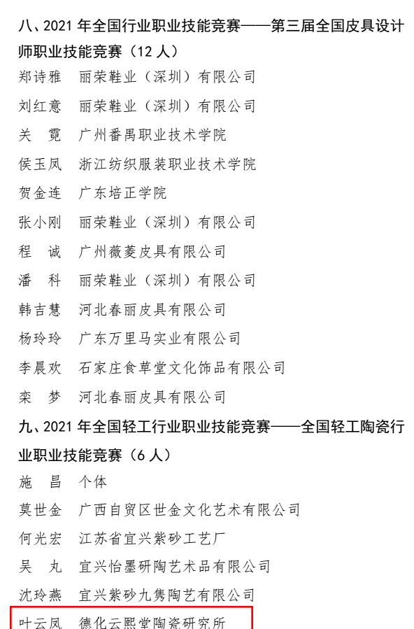近日,中國輕工業(yè)聯(lián)合會表彰了一批在2021年輕工各類職業(yè)技能競賽活動中取得優(yōu)異成績的選手,由福建省陶瓷行業(yè)協(xié)會選拔入圍第七屆全國陶瓷行業(yè)職業(yè)技能競賽總決賽的林宛文、蘇基石、林杰鋒、張麗芬、林祿揚(yáng)、王代丁、彭茶水、葉云鳳榮獲“全國輕工技術(shù)能手”榮譽(yù)稱號。