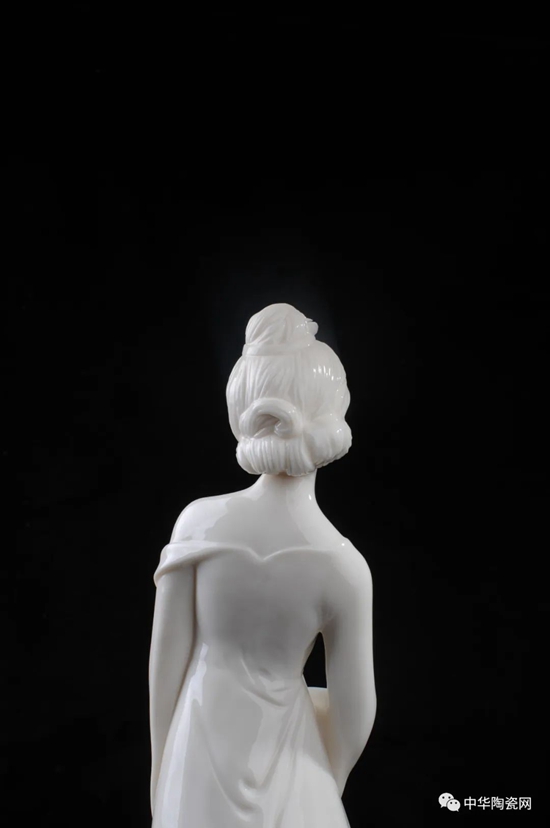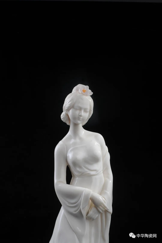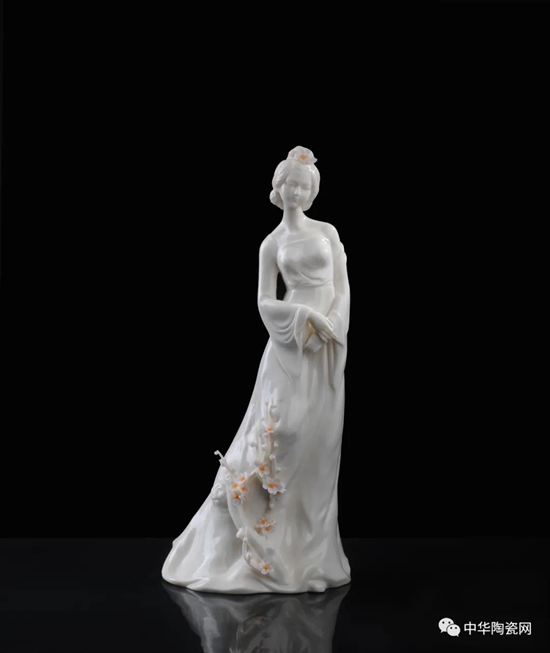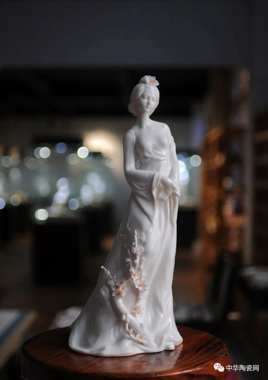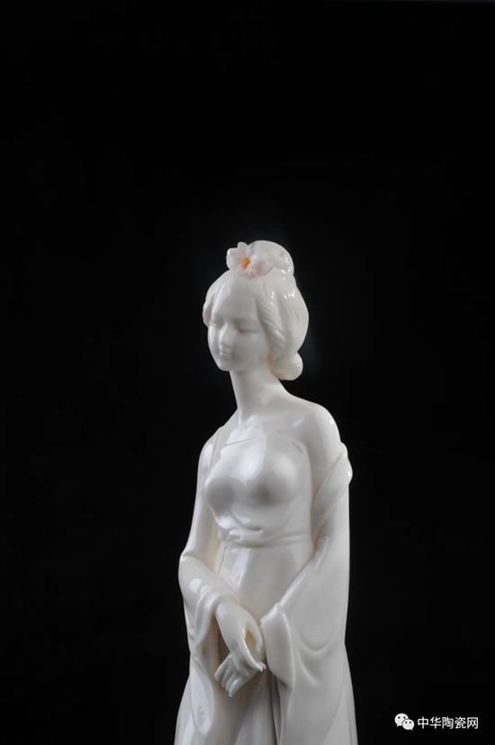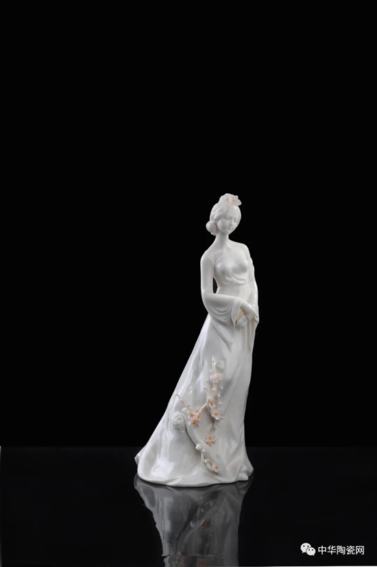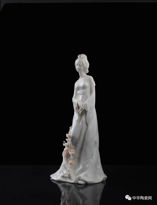 《花之夢(mèng)寒香》由全國(guó)技術(shù)能手——邱玉珍設(shè)計(jì)創(chuàng)作,作品采用德化白瓷為胎質(zhì),可見(jiàn)一女子身著長(zhǎng)裙,身體向一側(cè)稍曲,人物線條柔美,委婉動(dòng)人,采用手工瓷花捏花堆雕作為裝飾,使之更顯精細(xì)。