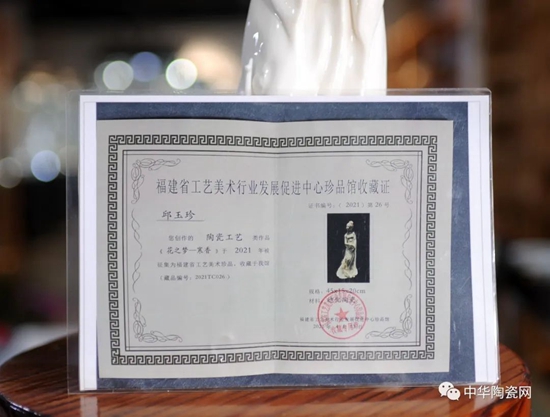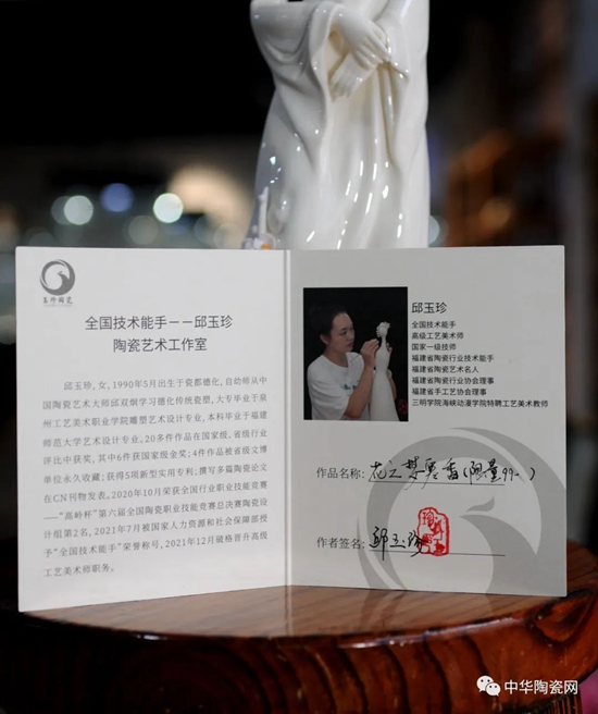邱玉珍,女,全國(guó)技術(shù)能手、高級(jí)工藝美術(shù)師、國(guó)家一級(jí)技師 、福建省陶瓷行業(yè)技術(shù)能手、福建省陶瓷藝術(shù)名人、福建省陶瓷行業(yè)協(xié)會(huì)理事、福建省手工協(xié)會(huì)理事、三明學(xué)院海峽動(dòng)漫學(xué)院特聘工藝美術(shù)教師。2016年畢業(yè)于福建師范學(xué)院,畢業(yè)后師從邱雙炯大師學(xué)習(xí)傳統(tǒng)雕塑。2020年中國(guó)技能大賽——“高嶺杯”第六屆全國(guó)陶瓷職業(yè)技能競(jìng)賽總決賽榮獲第二名;2020榮獲福建省陶瓷行業(yè)職工技能大賽暨2020年中國(guó)技能大賽第二名;2019年《長(zhǎng)相思》榮獲第七屆中國(guó)陶瓷名家作品展暨2019年陶瓷作品榮獲金獎(jiǎng),2018年作品《霓裳羽衣歌》榮獲第十二屆合肥國(guó)際文化博覽會(huì)優(yōu)秀作品評(píng)比金獎(jiǎng)等。