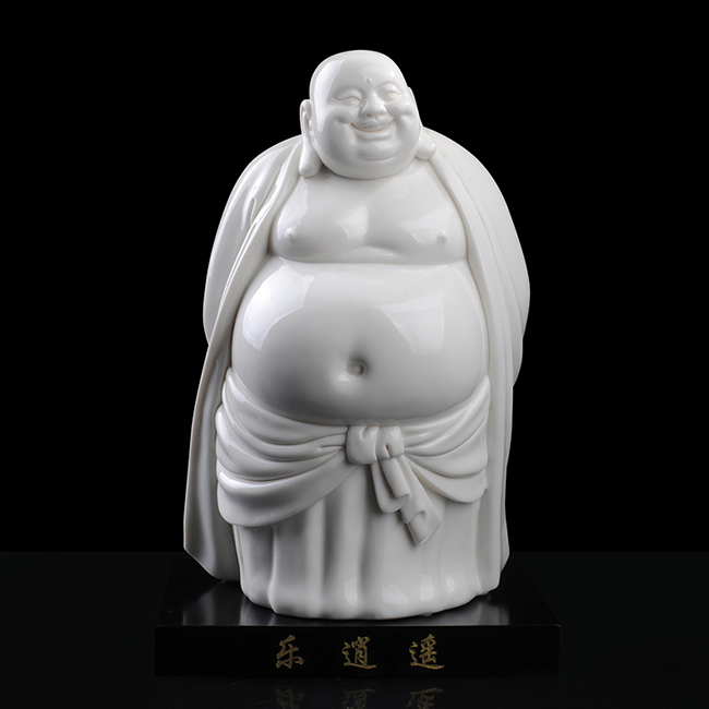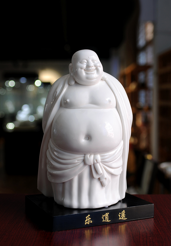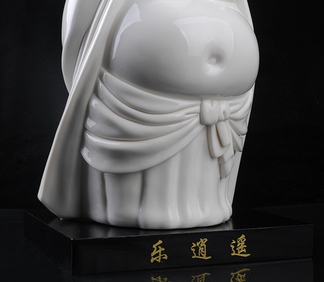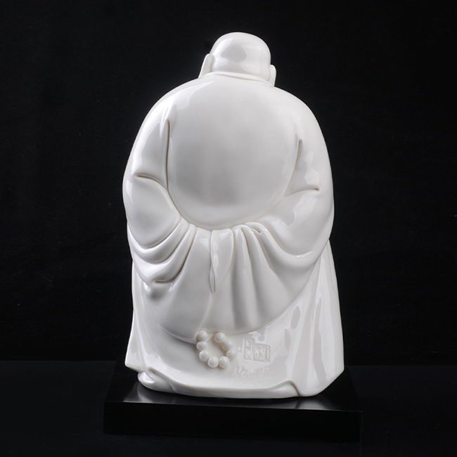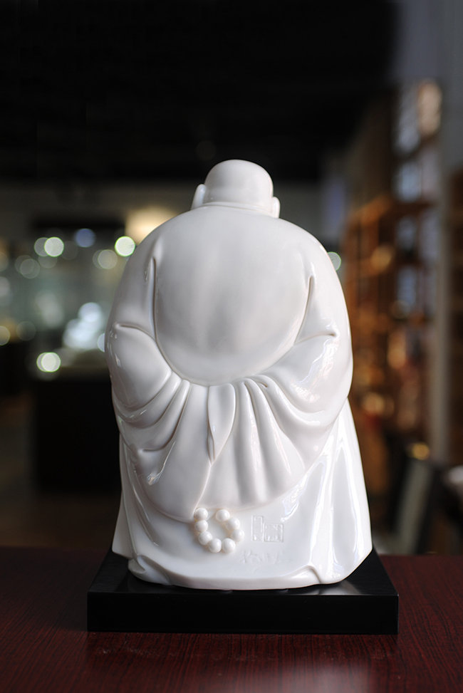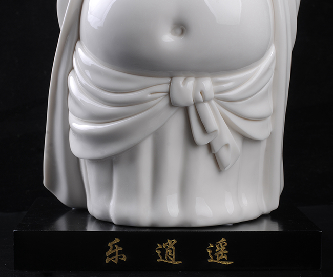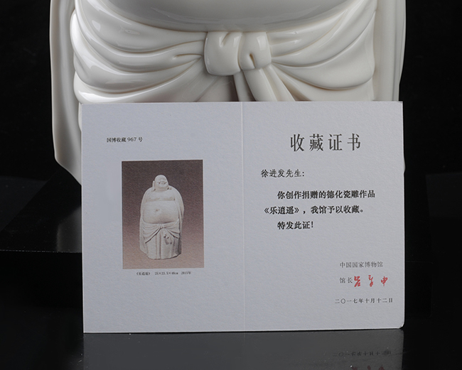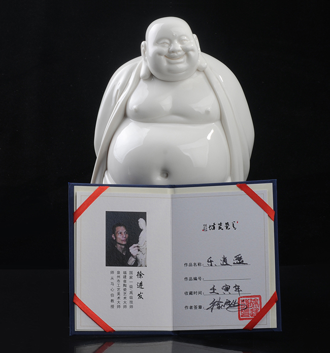 《樂(lè)逍遙》由福建省陶瓷藝術(shù)大師——徐進(jìn)發(fā)制作,作品長(zhǎng)20.5cm,寬17cm, 高31cm,采用德化優(yōu)質(zhì)高嶺土,經(jīng)1300多度高溫?zé),作品胎體溫潤(rùn),線條簡(jiǎn)潔柔美,精雕細(xì)刻,彌勒佛造型喜笑顏開(kāi),酒窩深陷,大耳垂肩,逍遙自在,形象刻畫(huà)生動(dòng),栩栩如生,手工雕刻展現(xiàn)精湛雕工。作品被中國(guó)國(guó)家博物館收藏,背面落有徐進(jìn)發(fā)大師手簽名及印章款,具有很高的收藏及鑒賞價(jià)值。