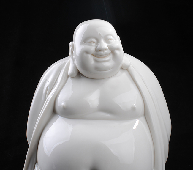 彌勒佛喜笑顏開(kāi),酒窩深陷,大耳垂肩,逍遙自在,刻畫(huà)生動(dòng)