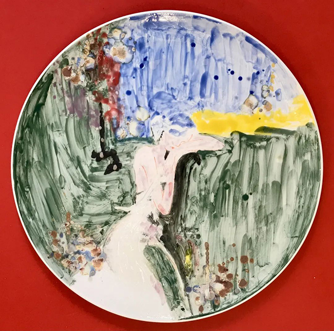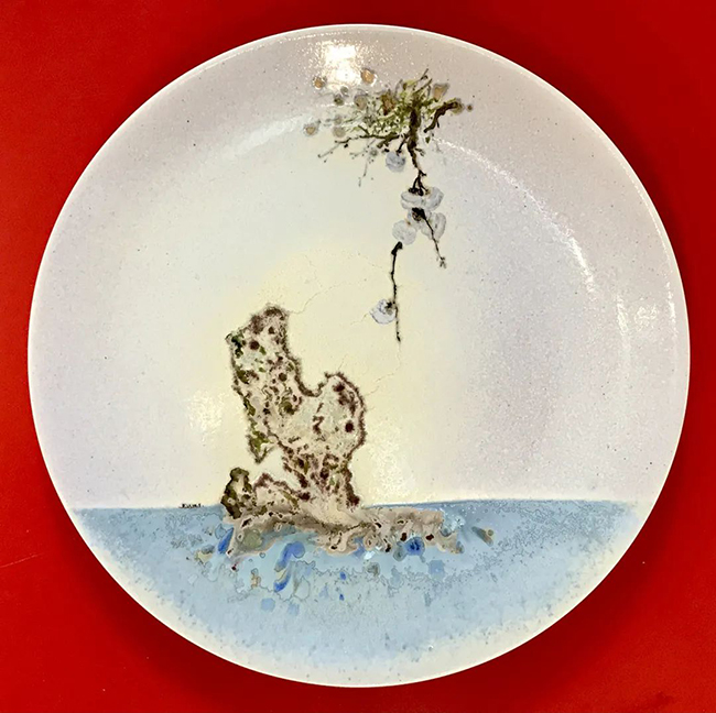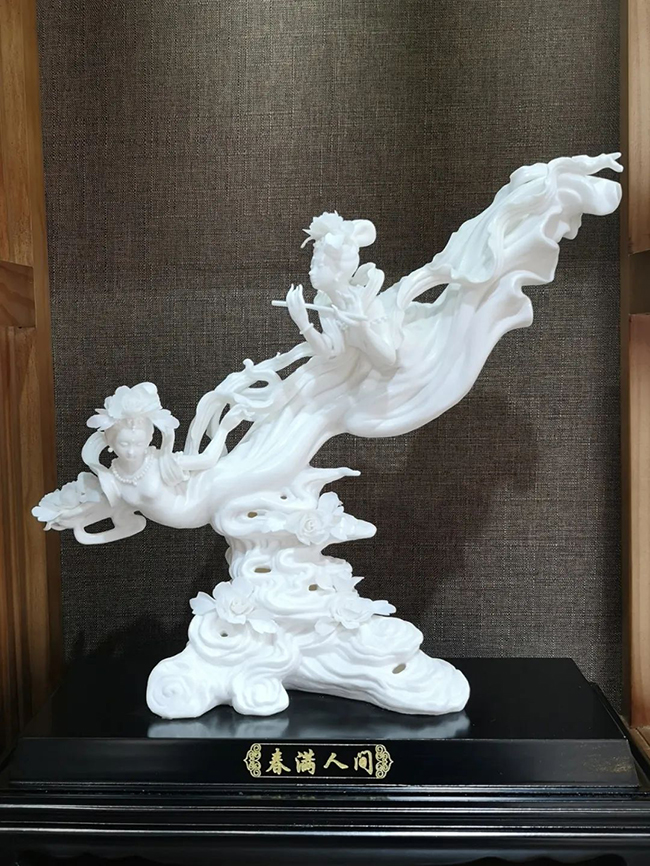 “飛行云中,神化輕舉,以為天仙,亦云飛仙”。邱桂還的《春滿人間》創(chuàng)作思路來源于敦煌壁畫飛天。在傳統(tǒng)瓷雕中,人物的塑造大部分以單體為主,該作品突破單體,傳承并創(chuàng)新,以泥塑去表現(xiàn)人物的形與神。此飛仙懸浮凌空,衣裙飄曳,巾帶飛舞,姿勢自如優(yōu)美,似凡塵中來。飛天落處,朵朵香花飄落,頗有"天花亂墜滿虛空"的詩意。洛神是中國先秦神話中,司掌洛河的地方水神。洛神作為理想美神的化身,喻指美麗的愛情、靚麗的青春、美好的生活。陳碧珍的《洛神》優(yōu)選顏色釉,巧妙運用亮麗豐富的色彩繪制婀娜多姿的洛神。以優(yōu)美抽象的曲線,與圓盤完美結(jié)合,相映成趣。其構(gòu)圖飽滿,虛實得當,筆法豐富,簡潔灑脫,富有美感