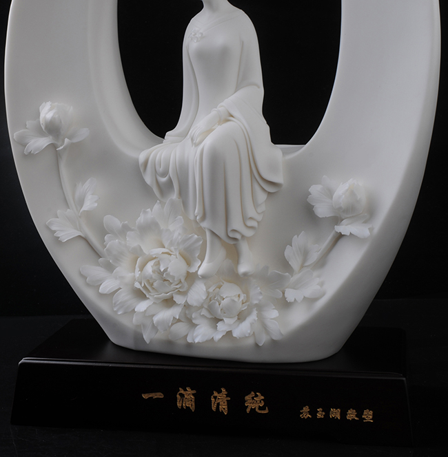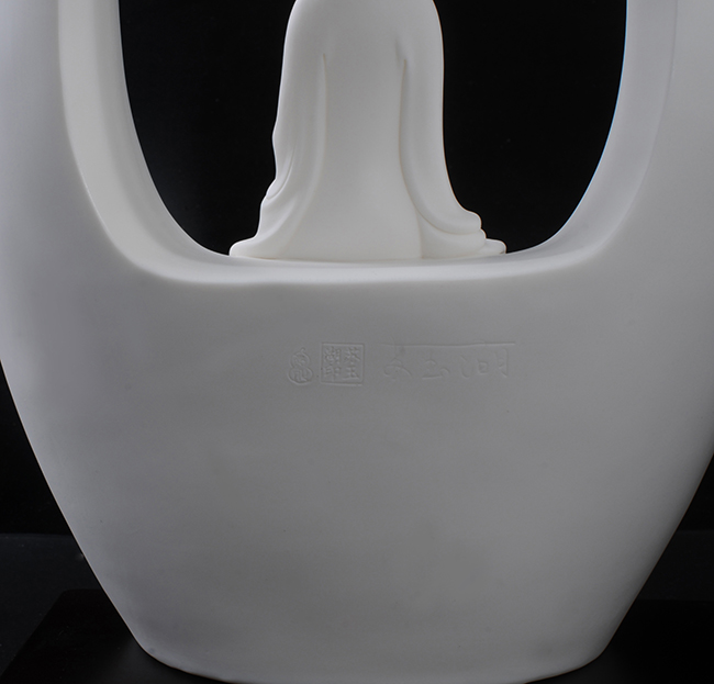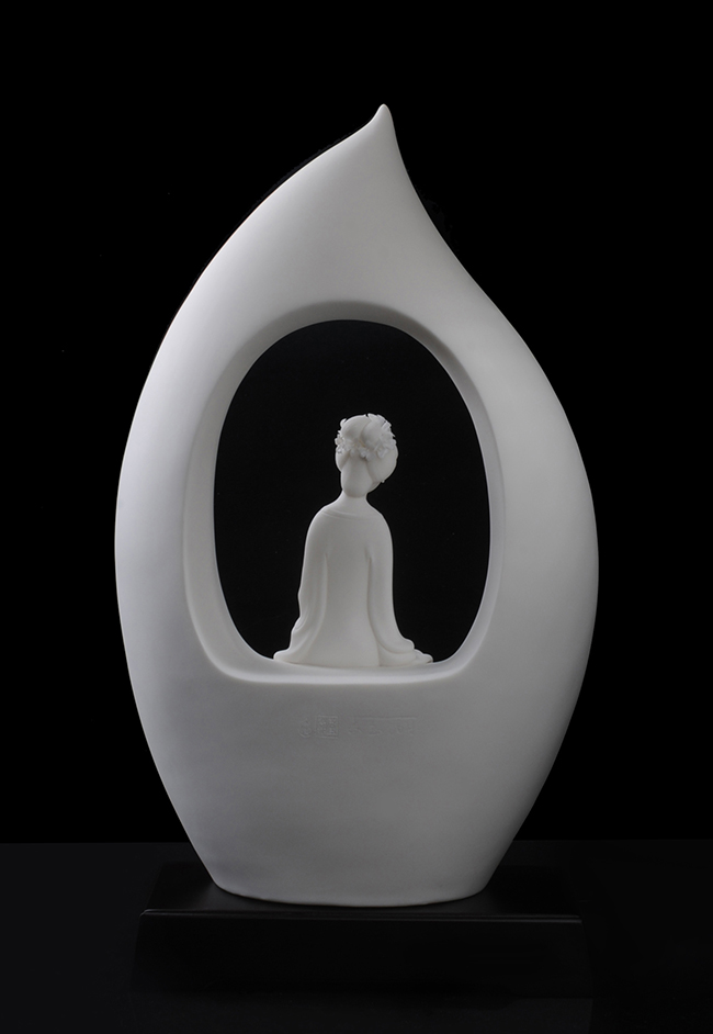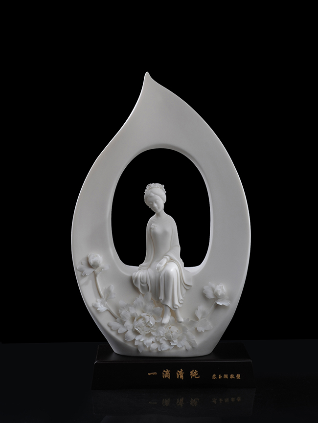 作品《一滴清純》以德化溫潤如玉的“中國白”為胎質(zhì),由福建省工藝美術(shù)大師蘇玉湖手工制作,整體以水滴為造型設(shè)計,少女雙目微閉,頭微微低垂,嘴角帶微笑,半側(cè)身優(yōu)雅而坐,似乎在聆聽著什么,所塑女子溫婉賢淑,神態(tài)逼真,刻畫細致,作品底部采用手工捏花做為裝飾,牡丹精細,使整件作品更精湛及富有詩意,水滴為外觀造型,借水之純,間接體現(xiàn)出少女豆蔻年花之美。作品雅氣、清秀, 作品背部落有蘇玉湖手刻簽名,是一件集收藏、家居裝飾的精品。