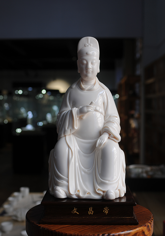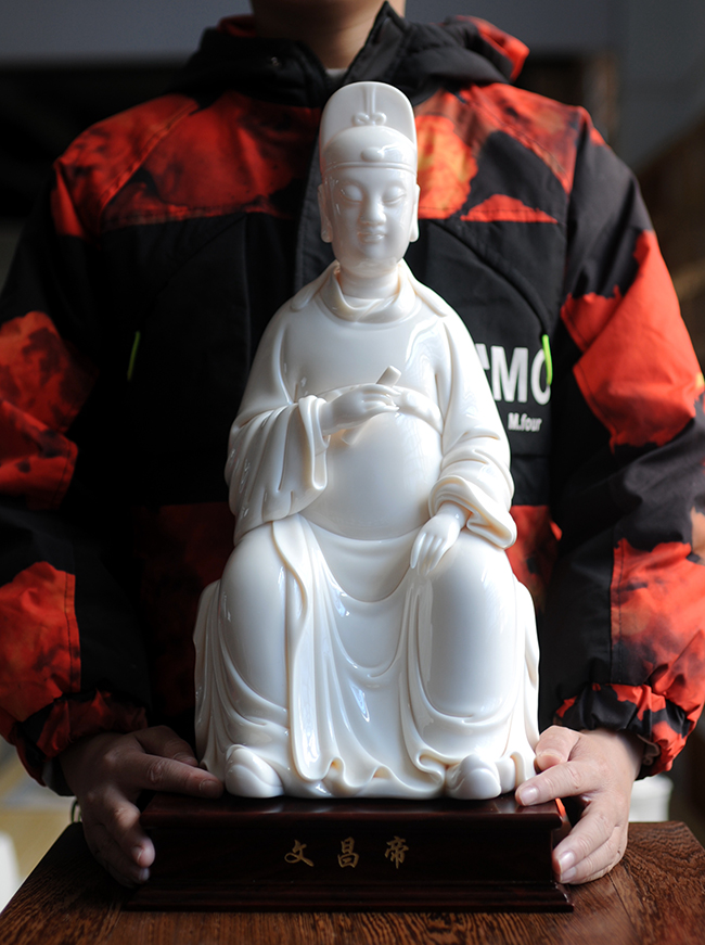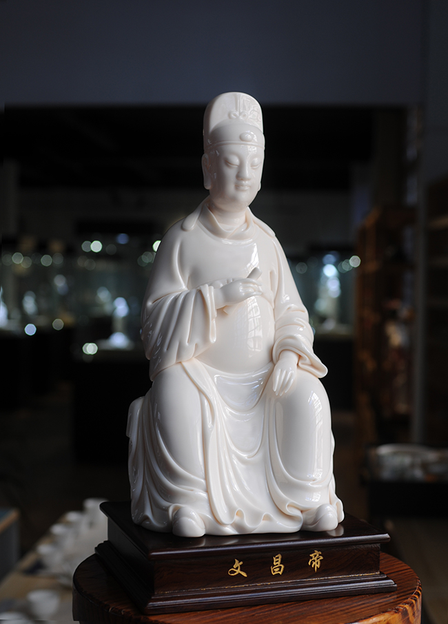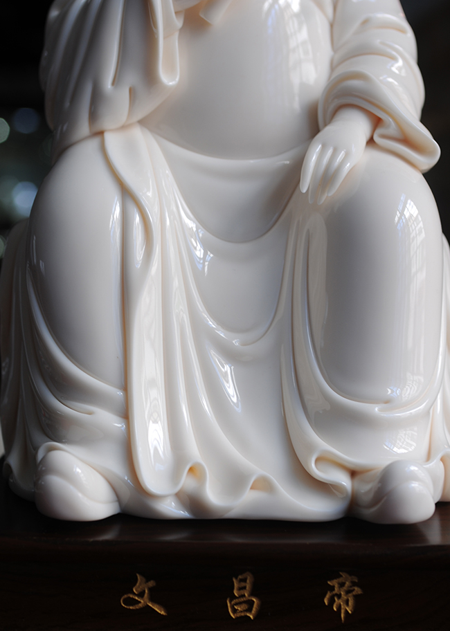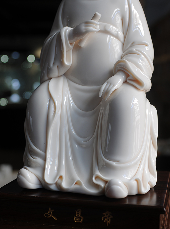 作品采用德化優(yōu)質(zhì)高嶺土,經(jīng)1300多度高溫?zé),瓷胎溫潤似玉透光性?qiáng)。作品傳承明代何派技法,以熟練的雕塑技巧和豐富的生活體驗(yàn),賦予文昌以鮮活的生命,使之更加世俗化、生活化,具有超凡脫俗之軒昂器宇,至今仍洋溢著感人的藝術(shù)魅力。衣紋刻劃線條深秀,簡潔瀟灑,變化多端且柔和流暢。文昌帝君頭戴唐巾(又稱進(jìn)士冠),兩巾角縛于后分垂頸肩;國字形臉龐,丹鳳眼,大耳,嘴角四周裂縫填充須髯;身穿寬袖長袍,一手執(zhí)書,一手自然下垂,雙足蹬靴微露;極富層次變化。整件瓷雕胎白,堅(jiān)實(shí)厚重,質(zhì)感瑩潤,是一件難得的收藏佳作。