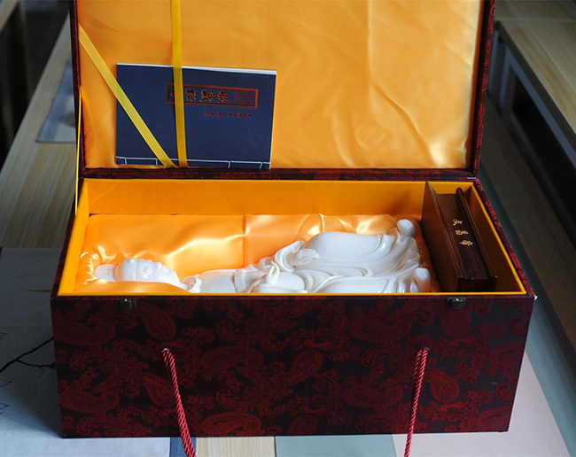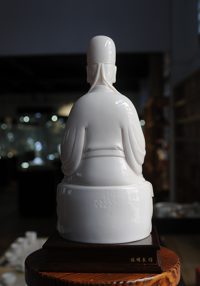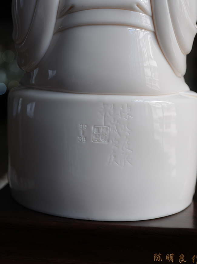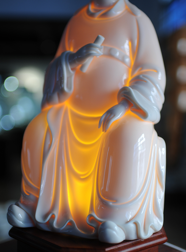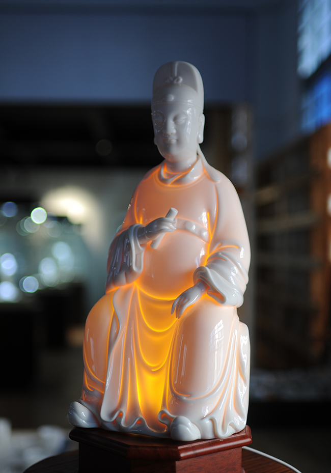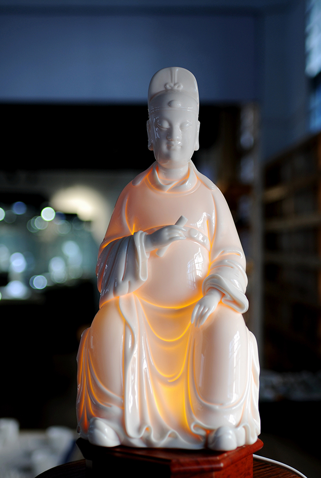 作品采用優(yōu)質(zhì)德化白瓷高嶺土,在燈光下瓷胎通透 溫潤似玉