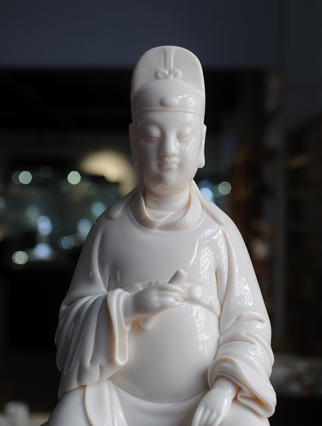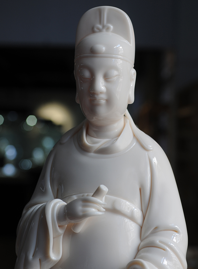 德化瓷器,以白瓷為最;白瓷之中,又以佛像為最。德化白瓷所塑佛像有性格鮮明、造型優(yōu)美、神態(tài)逼真、風(fēng)格洗練的特點(diǎn)。有一種單純的雕塑美和原材料的質(zhì)地美,最能體現(xiàn)佛教樸素、平和的思想。