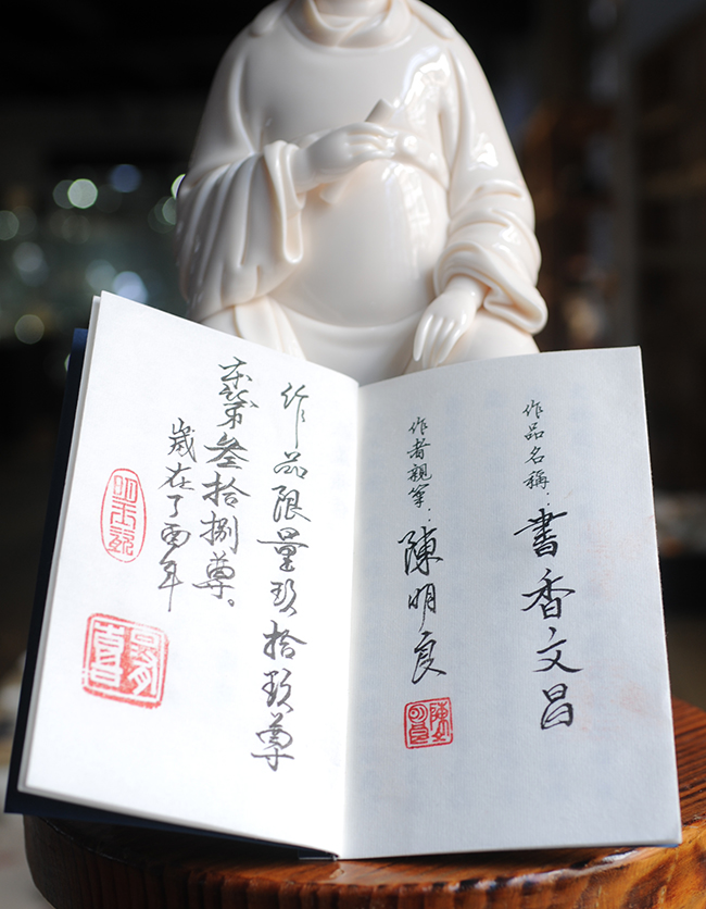 作品《書香文昌》由中國工藝美術(shù)大師陳明良創(chuàng)作,作品長寬高:21.5 x18X 42.5 CM,限量發(fā)行99件,作品背部有陳明良大師手刻簽。
