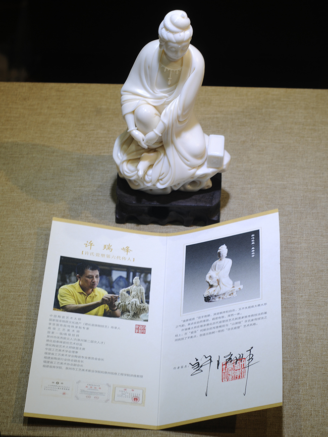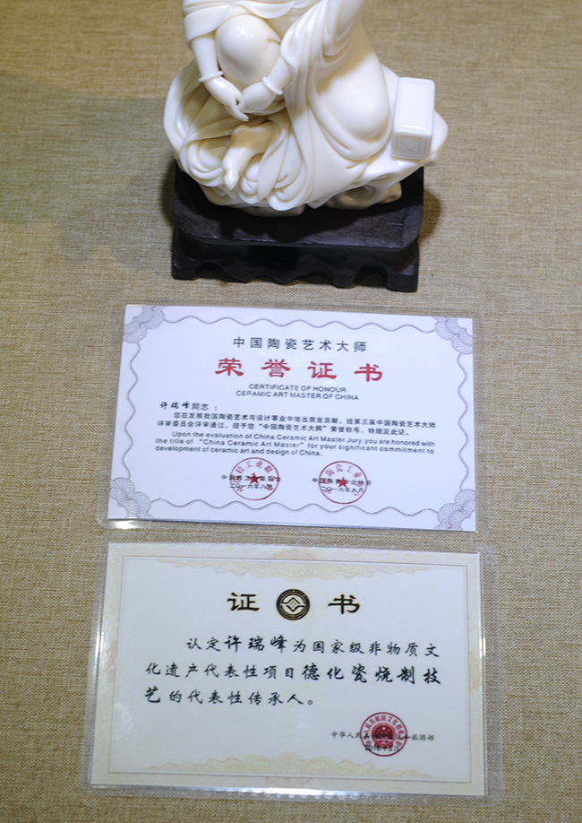許瑞峰,1969年生于福建省德化縣,是許氏瓷塑第六代傳人。第八屆中國工藝美術(shù)大師、中國陶瓷藝術(shù)大師、非物質(zhì)文化遺產(chǎn)(德化瓷燒制技藝)國家級傳承人、享受國務(wù)院政府特殊津貼,高級工藝美術(shù)師、泉州市優(yōu)秀拔尖人才。福建省商學(xué)院,泉州工藝美術(shù)學(xué)院、泉州市信息工程學(xué)院講座教授、福建省工藝美術(shù)協(xié)會副會長、福建省陶瓷工業(yè)協(xié)會副會長、德化縣政協(xié)常委。