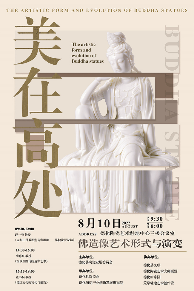 2022年8月10日,由德化縣陶瓷發(fā)展委員會主辦,陶瓷辦、德化陶瓷產(chǎn)業(yè)創(chuàng)新發(fā)展研究院承辦的名師講堂,將于德化陶瓷藝術(shù)駐地中心舉行。本次活動特邀清華大學(xué)美術(shù)學(xué)院董書兵教授、北京工業(yè)大學(xué)藝術(shù)設(shè)計(jì)學(xué)院李惠東教授、麥積山石窟藝術(shù)研究所研究員段一鳴等佛造像專家學(xué)者從專業(yè)的角度,剖析陶瓷宗教造像雕塑語言,探索魅力無窮的佛教造像藝術(shù)。
