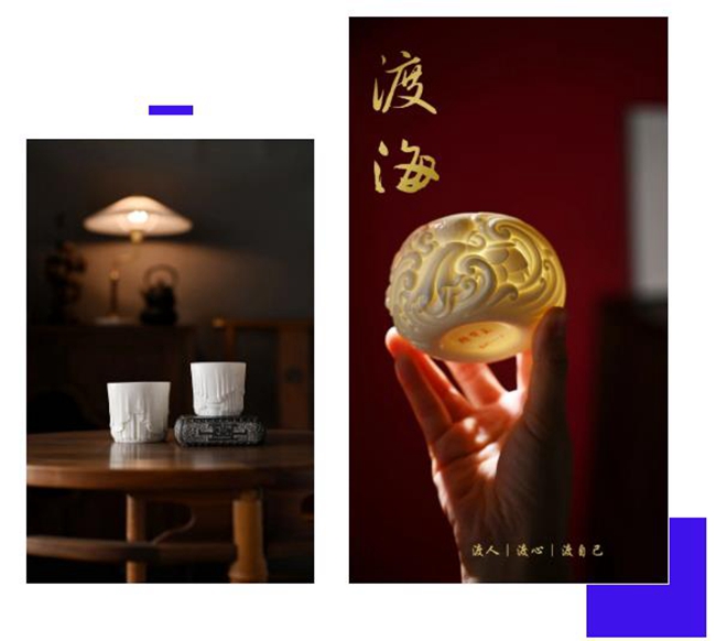 國(guó)家一級(jí)/高級(jí)技師徐華文帶來首發(fā)新品《百褶如意》《渡海》《月亮代表我的心》,其創(chuàng)意取自德化傳統(tǒng)觀音造像,他將垂拂流轉(zhuǎn)的衣褶,起伏翻涌的波浪融入到日用產(chǎn)品設(shè)計(jì)中,用傳統(tǒng)文化嫁接現(xiàn)代技藝,賦予平常的水杯新的形象與內(nèi)涵,令人耳目一新。
