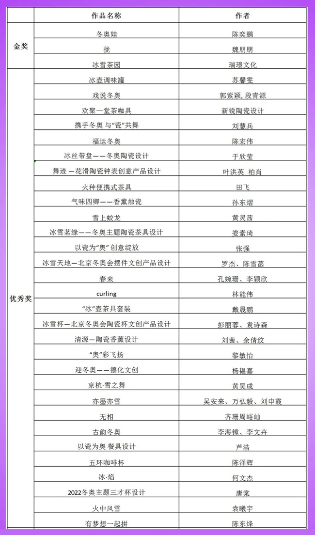 頒獎(jiǎng)儀式上隆重揭曉了2022冬奧陶瓷文創(chuàng)設(shè)計(jì)獲獎(jiǎng)作品,包括金獎(jiǎng)3名 、優(yōu)秀獎(jiǎng)30名、組織獎(jiǎng)10名。