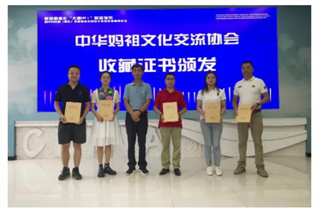 中國(guó)航海博物館2021年收藏了我縣61件(套)媽祖主題的德化藝術(shù)陶瓷精品,為此,現(xiàn)場(chǎng)還舉行了作品收藏證書的頒發(fā)儀式。中華媽祖文化交流協(xié)會(huì)常務(wù)副秘書長(zhǎng)周金琰、德化恒豐佳創(chuàng)陶瓷有限公司陳麗萍、德化陶瓷產(chǎn)業(yè)創(chuàng)新發(fā)展研究院執(zhí)行院長(zhǎng)張梓潯分別為陶瓷創(chuàng)作者們頒發(fā)了收藏證書。