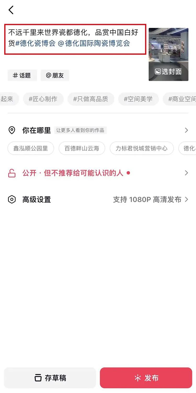 參賽者在規(guī)定活動時間內(nèi),將參賽作品上傳到自有抖音號,配文案 + #德化瓷博會#話題,并@“德化國際陶瓷博覽會”官方抖音號后發(fā)布即可參賽。