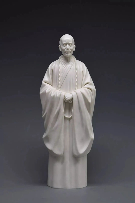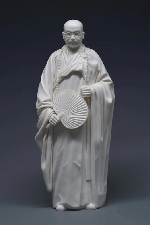 在此,弘一法師題材的陶瓷藝術(shù)品排滿壁柜,或坐或站,每一尊雕像都透出弘一法師獨(dú)特的慈悲神情。