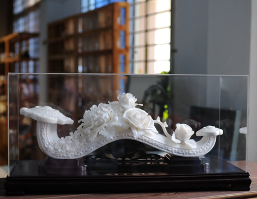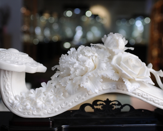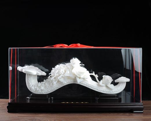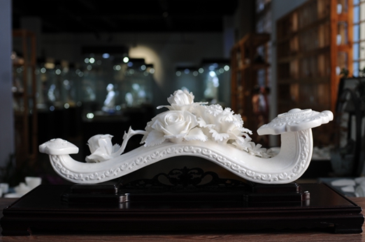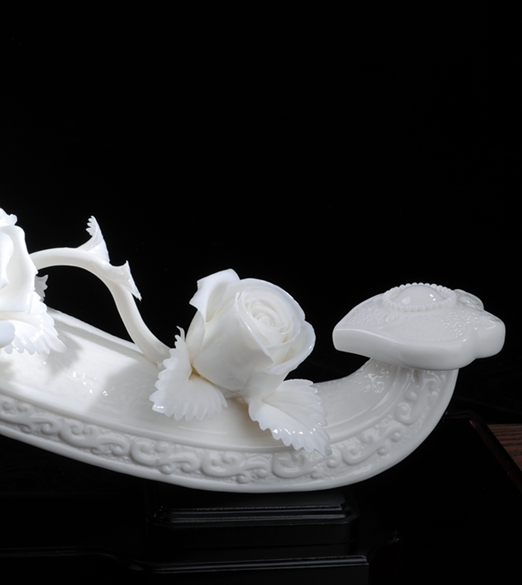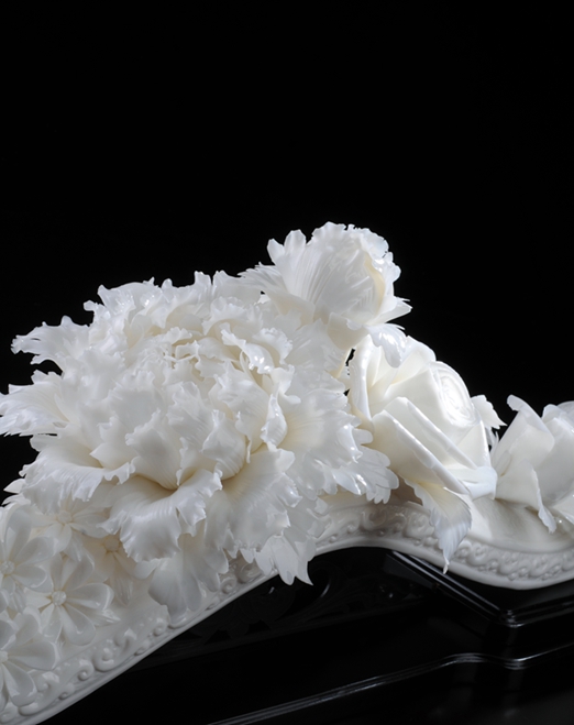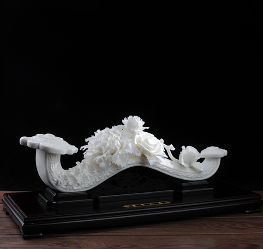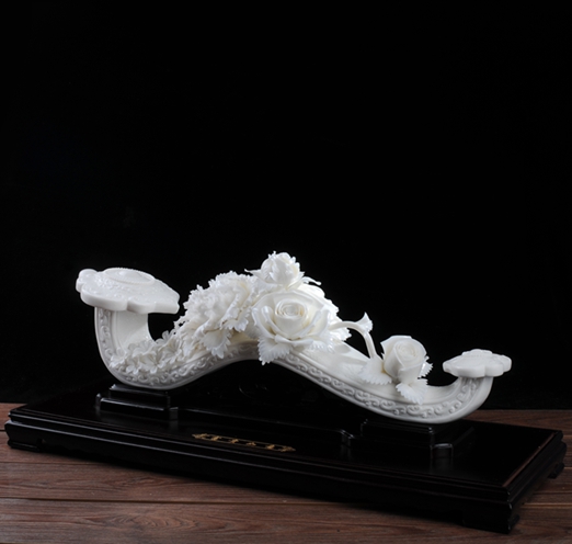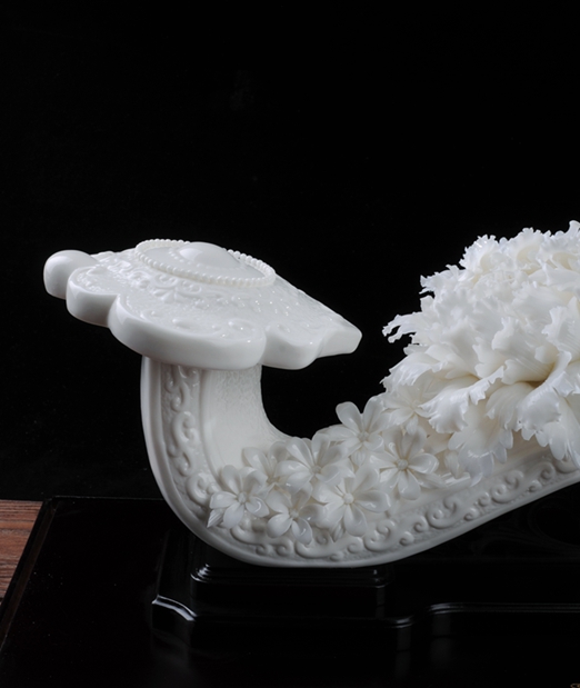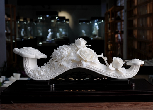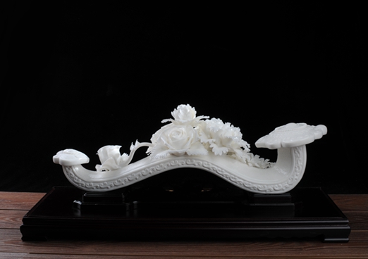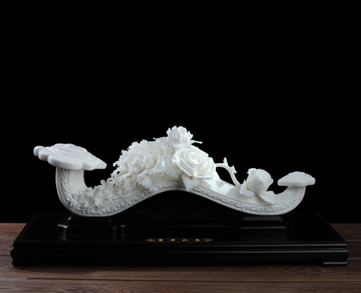 《富貴如意》以德化具有溫潤如玉的”中國白" 為胎質(zhì)塑造,德化瓷與傳統(tǒng)如意文化相結(jié)合雕刻而成。 作品如意之上可見有牡丹、玫瑰花、小花雕刻點綴等,白色的玫瑰花干凈無暇,牡丹代表富貴,樹葉枝干線條流暢、簡潔,整件作品構(gòu)思巧妙,布局合理,把富貴如意這一美好寓意表現(xiàn)得淋漓盡致。