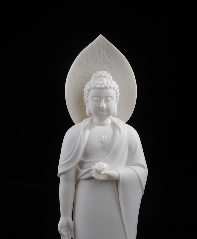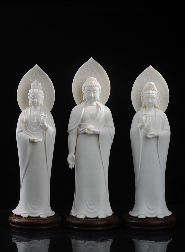 《佛光西方三圣》由國家高級/一級技師林弋新設(shè)計(jì)創(chuàng)作。作品以德化溫潤如玉的 “中國白”為胎質(zhì),經(jīng)1300多度高溫?zé)疲ンw溫潤如玉,瓷感細(xì)膩。