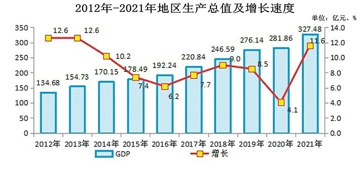 這十年,我縣經(jīng)濟(jì)快速發(fā)展。2012年地區(qū)生產(chǎn)總值(GDP)134.68億元,2021年,這一數(shù)字達(dá)到327.48億元,連跨2個(gè)百億大關(guān),增長了1.4倍多;2022年1-6月地區(qū)生產(chǎn)總值(GDP)達(dá)139.13億元。