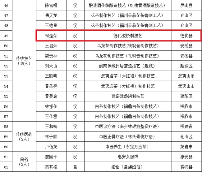 9月23日,福建省文旅廳網(wǎng)站發(fā)布公示,經(jīng)專家評審、評委會審議并報廳務(wù)會研究審定,提出了福建省第六批國家級非物質(zhì)文化遺產(chǎn)代表性傳承人推薦申報名單共62人,其中,德化縣柯逢榮上榜。