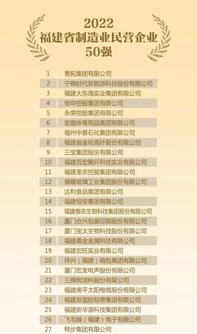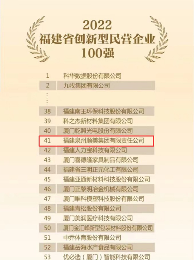 9月26日,福建省工商聯(lián)發(fā)布2022福建省民營(yíng)企業(yè)100強(qiáng)、2022福建省制造業(yè)民營(yíng)企業(yè)50強(qiáng)、2022福建省創(chuàng)新型民營(yíng)企業(yè)100強(qiáng)三個(gè)榜單。順美集團(tuán)榮列“2022福建省創(chuàng)新型民營(yíng)企業(yè)100強(qiáng)”