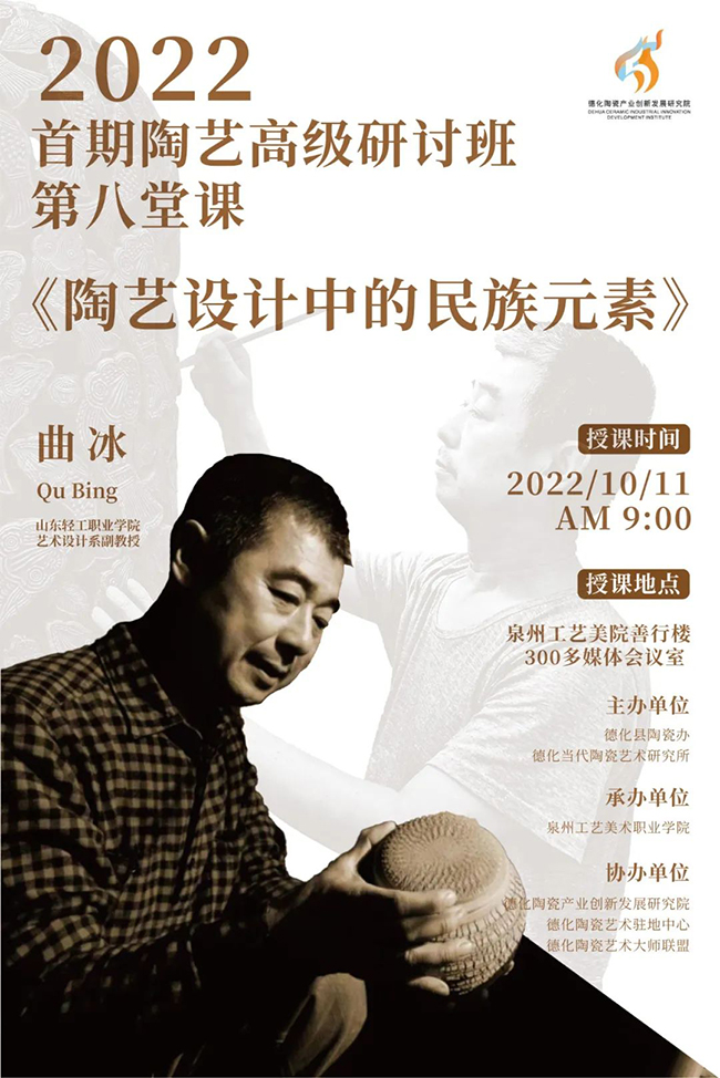 陶瓷藝術(shù)是世界性的審美共性,是超越文化與意識(shí)形態(tài)的語言方式,與生活息息相關(guān)。為加強(qiáng)德化縣與清華美院合作交流,提升德化白瓷設(shè)計(jì)和藝術(shù)水平,推動(dòng)當(dāng)代陶瓷藝術(shù)轉(zhuǎn)型,開展德化當(dāng)代陶瓷藝術(shù)研究所教學(xué)實(shí)踐活動(dòng),我們邀請(qǐng)了山東輕工職業(yè)學(xué)院藝術(shù)設(shè)計(jì)系曲冰副教授到我縣開展2022首期陶藝高級(jí)研討班第八堂課。誠邀您的參與,一起碰撞出新時(shí)代陶瓷設(shè)計(jì)和藝術(shù)的新思想、新水平、新風(fēng)范。