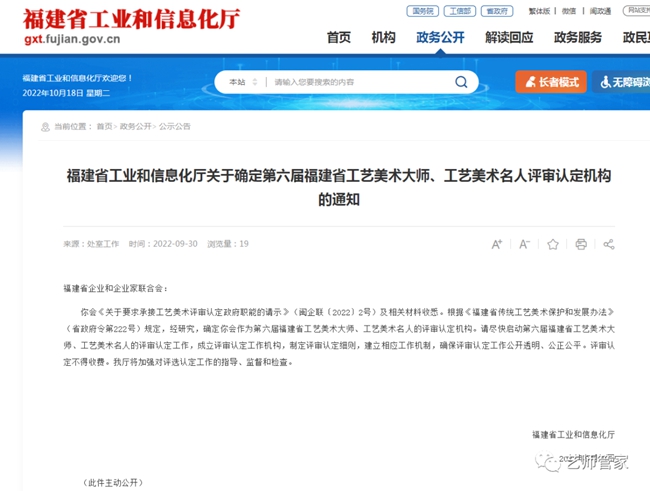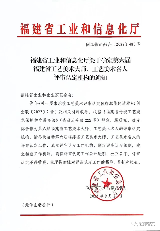 2022年9月29日,福建省工業(yè)和信息化廳發(fā)布關(guān)于確定第六屆福建省工藝美術(shù)大師、工藝美術(shù)名人評審認定機構(gòu)的通知。