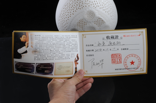 《如意通花》由中國陶瓷藝術(shù)大師陳明華設(shè)計創(chuàng)作。作品以德化溫潤如玉的 “中國白”為胎質(zhì),經(jīng)1300多度高溫?zé)疲髌吩O(shè)計巧妙,雙耳以如意為造型設(shè)計,線條流暢富有動感,制作手法精妙、工序復(fù)雜,仿似在瓷中“剪紙”,瓷上“飛花”。整體清秀唯美,創(chuàng)意感足,作品底部落有大師手刻簽落款,兼具審美價值和收藏價值,是不可多得的雅作。是辦公、家居、書房裝飾擺設(shè)、禮贈、收藏的好選擇。