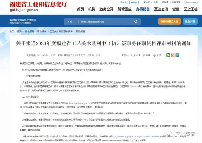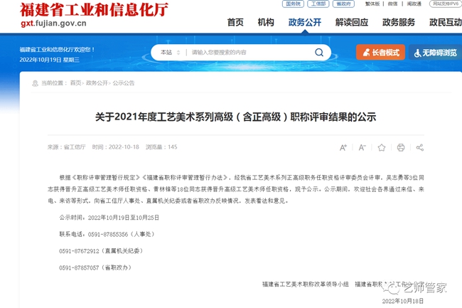 2022年10月18日,福建省工業(yè)和信息廳官網(wǎng)正式公布2021年度工藝美術(shù)系列高級(含正高級)職稱評審結(jié)果,其中吳志勇等3位同志獲得晉升正高級工藝美術(shù)師,黃林鋒等18位同志獲得晉升高級工藝美術(shù)師。