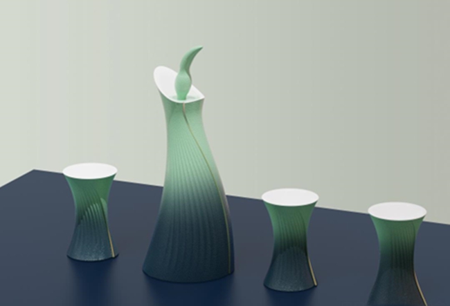設(shè)計說明:只此青綠分酒器造型靈感來源舞蹈詩劇《只此青綠》,整體造型宛若舞者衣袂翩翩,以當(dāng)代的表達(dá)方式敘述悠遠(yuǎn)綿長的傳統(tǒng)文化意境。千里江山青綠的漸變釉色配合條紋的造型讓人感受到虛實(shí)交錯的美感。頂部放大的壺嘴讓酒更容易倒入瓶內(nèi);延長的壺嘴使出斷水利落卻細(xì)膩,便于分酒。
