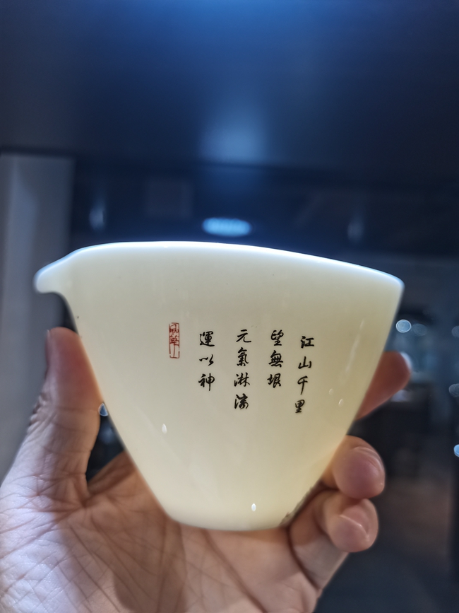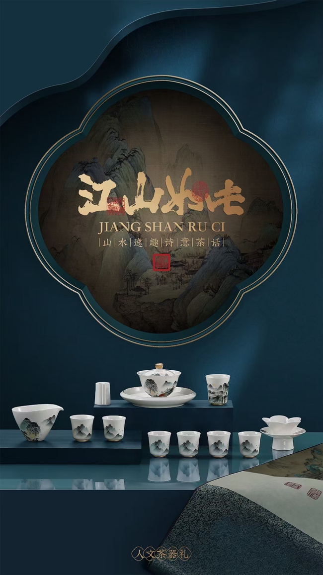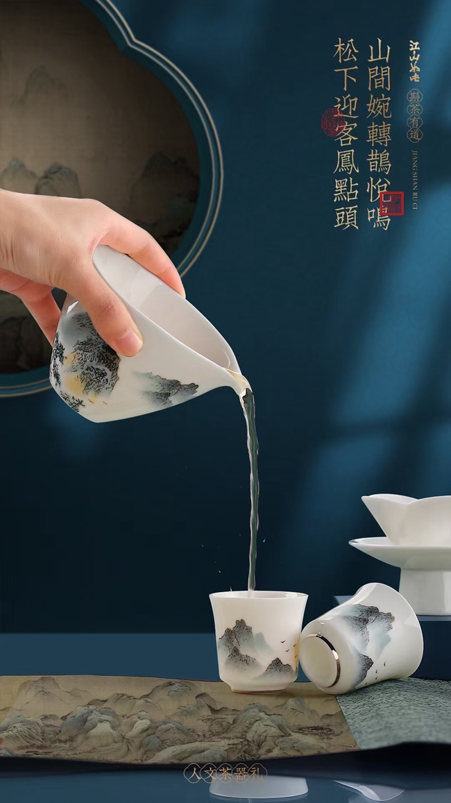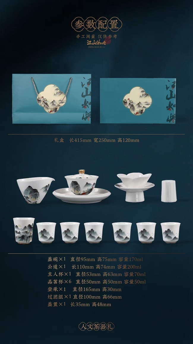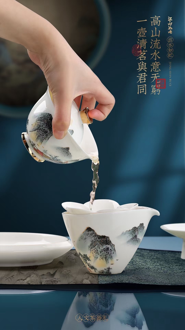 江山如此羊脂玉茶具器由工藝美術大師設計,精選優(yōu)質高嶺土,經(jīng)加工1300多度高溫燒制而成,其瓷質溫潤似玉、透光性強,胎骨潔白,作品采用手工堆金描金工藝,采用中國水墨山水畫設計,瓷坯為紙,匠心手繪,筆觸瀟灑,意境水墨畫,鎏金點綴,品質尊貴,禮盒包裝上檔次,是品茶、家居、禮品好選擇。