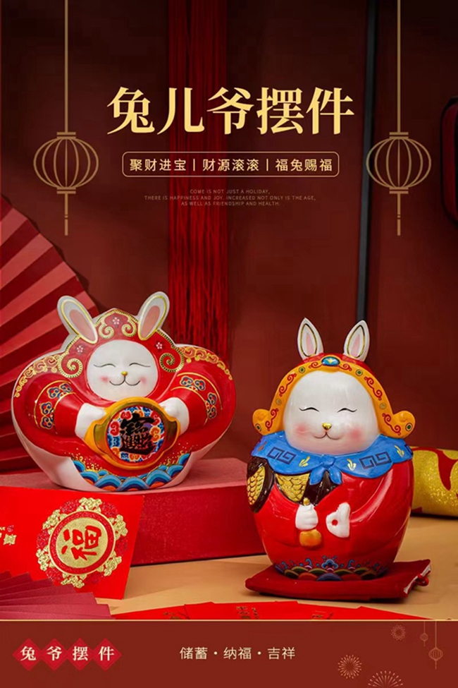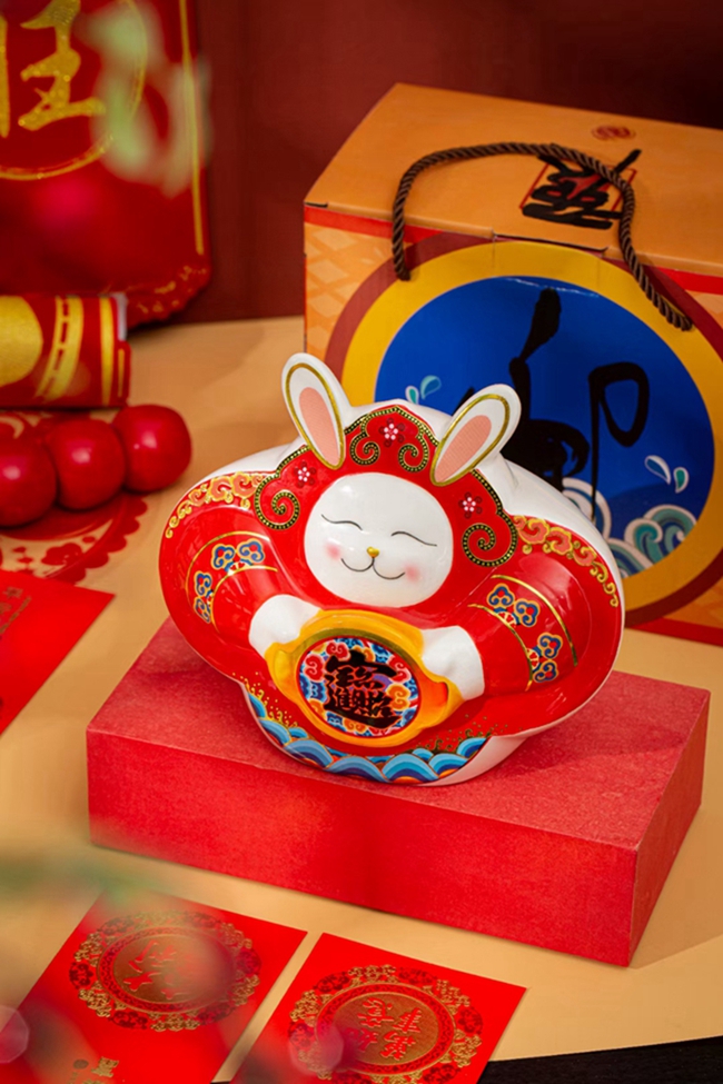 以“兔”、“春”作為主要設(shè)計元素,中國紅為主色調(diào),融入古風(fēng)、古典、喜慶等手繪裝飾,濃濃吉祥中國風(fēng),擺件從里到外滿滿都是亮點。俏皮可愛的兔子,頭頂如意,滿臉笑意,手捧金元寶,像喜樂融融的在喜迎接新春的到來,整器設(shè)計、工藝細節(jié)滿滿呢!