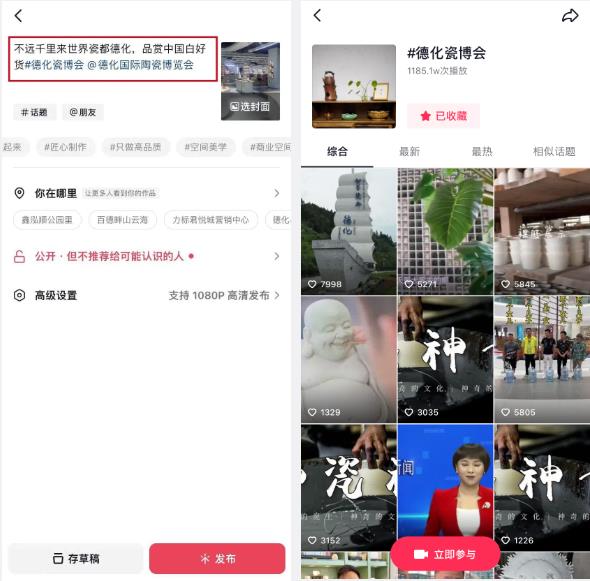 參賽者在規(guī)定活動(dòng)時(shí)間內(nèi),將參賽作品上傳到自有抖音號(hào),配文案 +#德化瓷博會(huì)#話題,并@“德化國(guó)際陶瓷博覽會(huì)”官方抖音號(hào)后發(fā)布即可參賽。