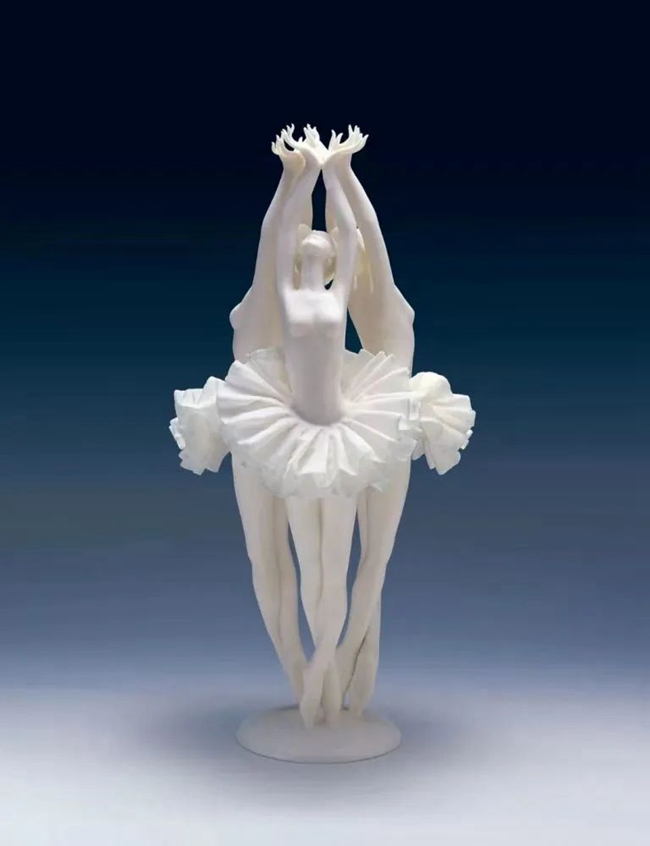 走進(jìn)瓷藝城大師館,映入眼簾的便是中國(guó)工藝美術(shù)大師許興泰的白瓷作品《觀音頭像》,觀音頭梳發(fā)髻,經(jīng)過(guò)許興泰打磨的秀發(fā)紋理分明,細(xì)膩溫潤(rùn)。另一處展柜呈現(xiàn)的《天鵝湖》由柯宏榮、陳桂玉共同創(chuàng)造,三位芭蕾少女踮起腳尖、高舉雙手,在渺渺樂曲中一展舞姿。邱雙炯制作的仕女持扇輕笑、神態(tài)嬌柔,她身著綾羅,瓷土燒制的裙擺皺褶如水波粼粼,仿佛當(dāng)真由綢緞編織而成……諸位大師作品齊聚一堂,無(wú)聲交談中,盡顯德化陶瓷美學(xué)魅力。