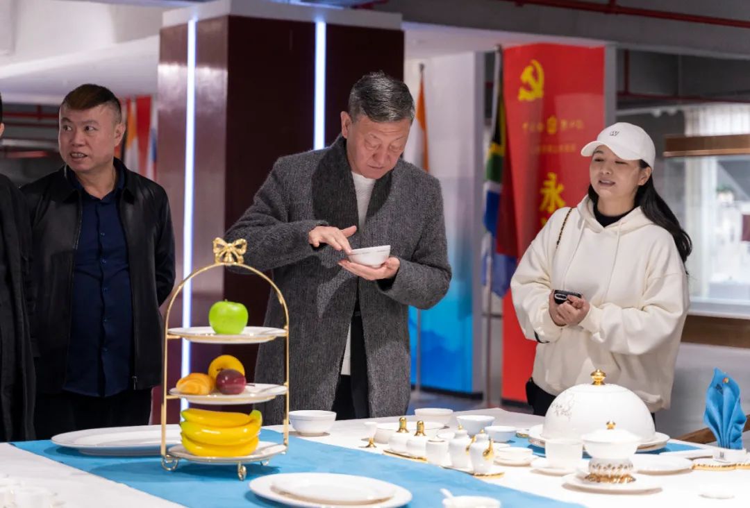 在參觀“舌尖上的金專餐廳”時,韓磊老師一行親手觸摸著溫潤明凈、精巧秀雅的2017金專國家領導人廈門會晤宴用瓷,親身體驗其實用性與藝術性的完美統(tǒng)一。韓磊老師表示:此次來到德化,來到中國白藝術宮參觀,感到十分震撼,通過中國白陳仁海,對中國瓷器有了新的認識。他還豎起大拇指,為世界瓷都——德化點贊,為德化“中國白”點贊。