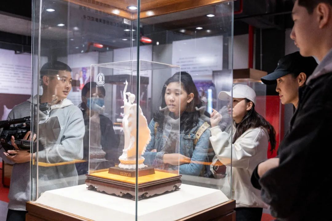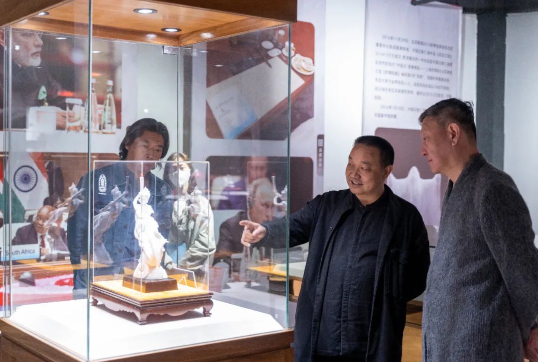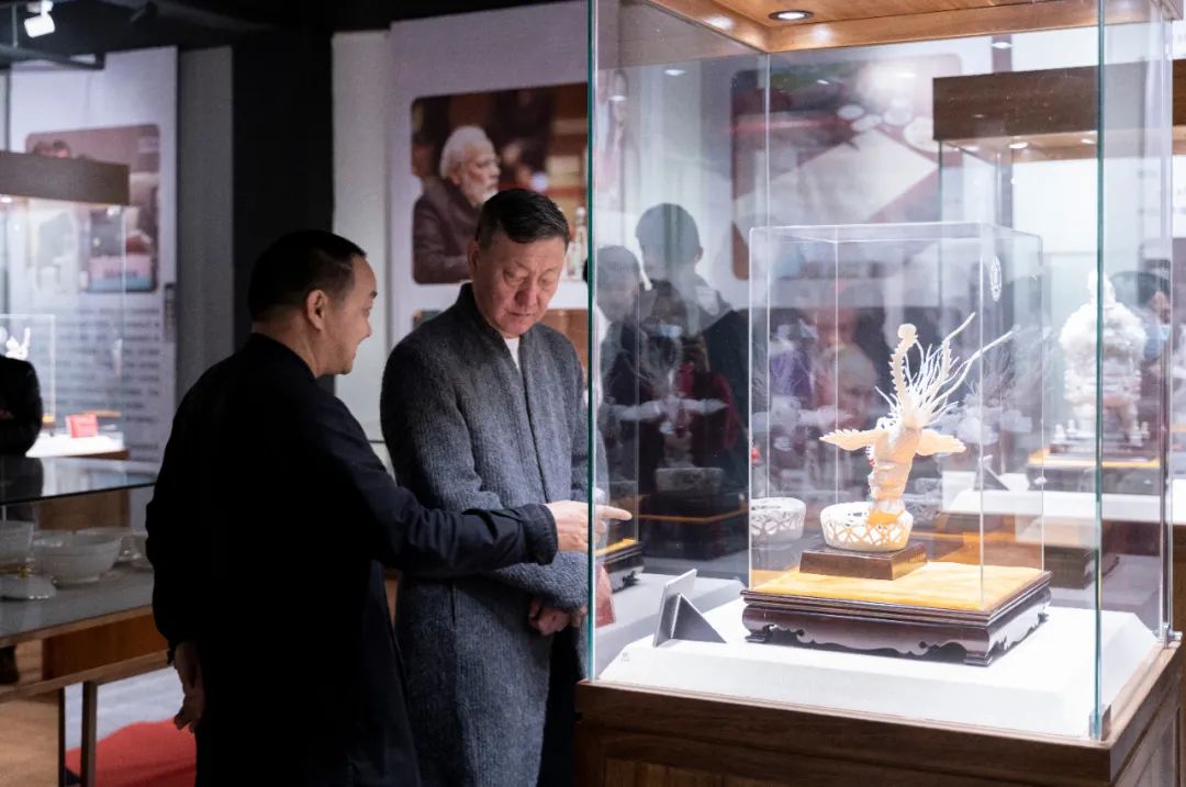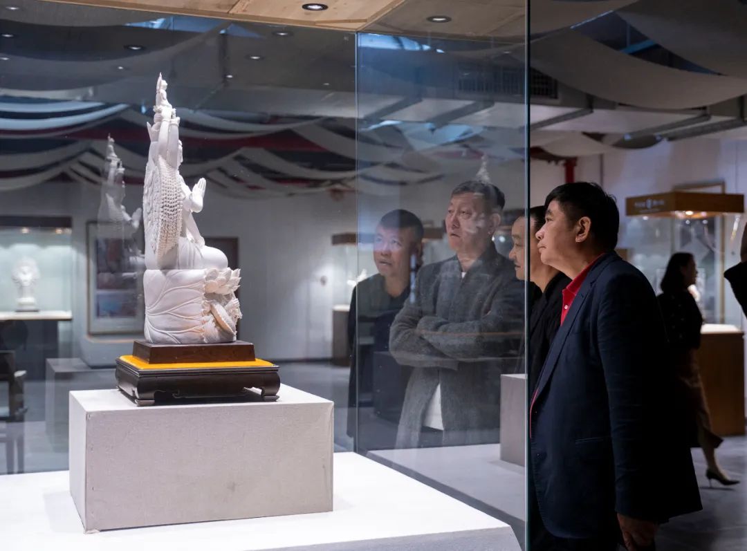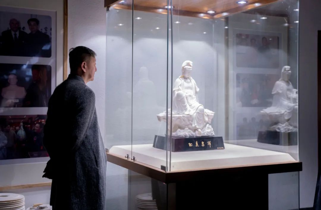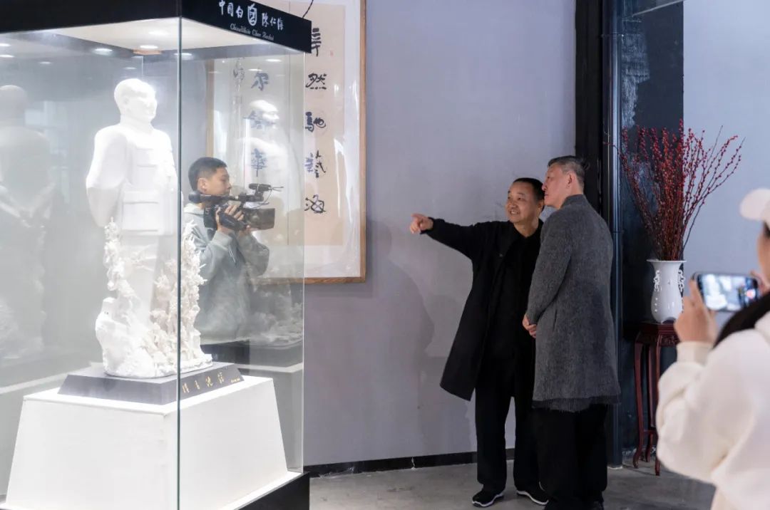 隨后,韓磊老師一行饒有興致的鑒賞了中國白陳仁海團隊創(chuàng)作的《紫歸牡懷》《閩龍出!贰墩l主沉浮》《夢回大唐》《點亮世界》《開拓輝煌》等一系列見證國家發(fā)展歷程,貼近時代、貼近生活、貼近群眾,富有時代特征的瓷雕藝術作品,近距離感受中國白陳仁海團隊堅持“中國白”文化自信,三十年只做一件事——復興中國白,引領“中國白”文化走向世界的創(chuàng)作初心以及中國白陳仁海團隊與國家同命運共呼吸、融史于瓷、精雕細琢、精益求精的創(chuàng)作匠心。