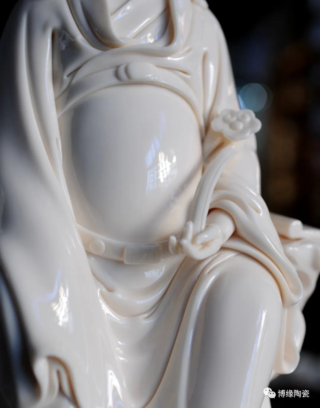 早在明代德化白瓷佛像就名聲在外,一代“瓷圣”何朝宗佛像名作流傳后世,成為世界各大博物館收藏的珍品,更對佛像雕塑史上產(chǎn)生深遠的影響,形成“何派”雕塑,其開創(chuàng)的捏、塑、雕、刻、刮、削、接、貼八字技法延用至今。何派觀音雕塑注重于細節(jié)之美,精益求精,故而十分著意衣紋的刻畫,使線條流暢,翻轉(zhuǎn)自然。觀其佛像,仿佛有春風(fēng)拂面,衣袂飄揚的出塵之感。