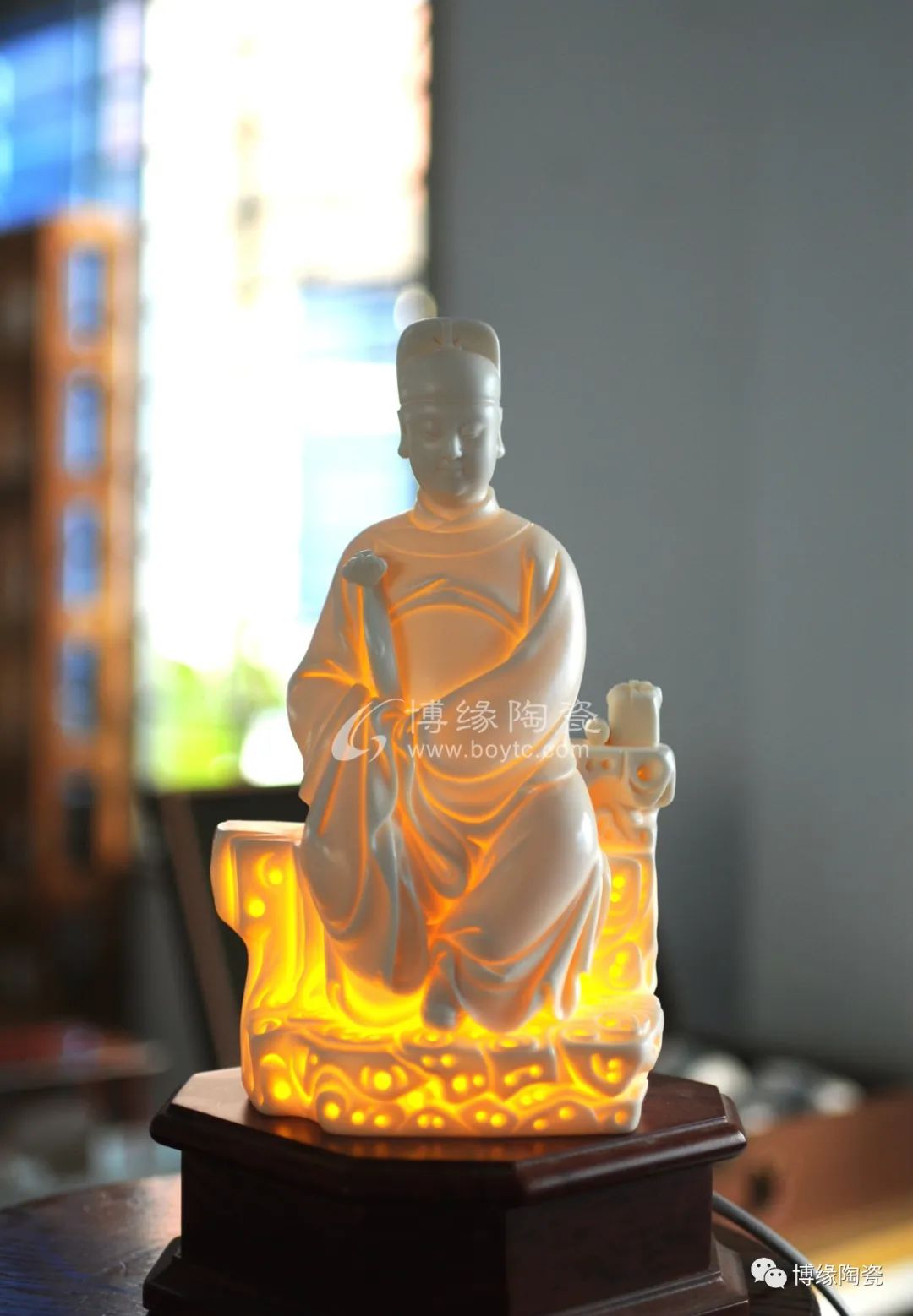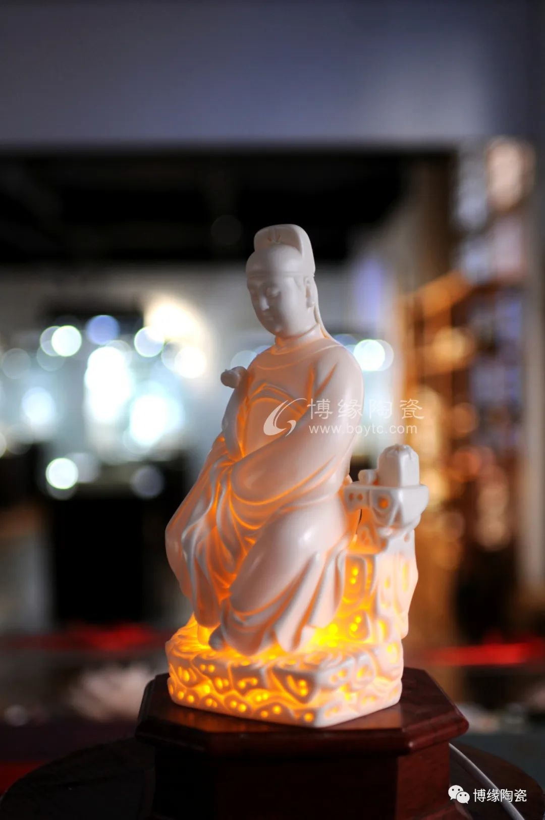 采用優(yōu)質(zhì)瓷泥燒制,燈光下,作品瓷胎通透、溫潤、透光性強(qiáng)。