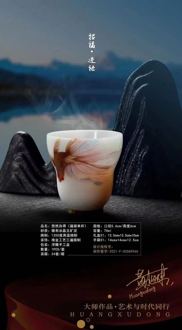 這是渡景山房藝術總監(jiān)黃旭東創(chuàng)作的《悠然自得》系列產品,以稀有的冰凝玉礦泥為材質,采用堆金工藝,高溫1350度燒制而成。他在傳統(tǒng)陶瓷藝術之上加入新的變化和創(chuàng)意,結合新材料的運用,產品特征鮮明,極富藝術感染力?吹剿,或許,你無法對它在設計風格、創(chuàng)作技法等方面說出個子丑寅卯,但它的魅力毫不掩飾,不會因為你對它的陌生而減少。