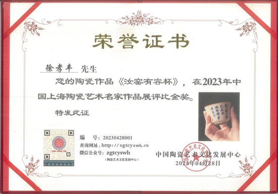 近日,徐孝豐《汝窯有容杯》榮獲2023年中國上海陶瓷藝術(shù)名家作品展評(píng)比金獎(jiǎng)。