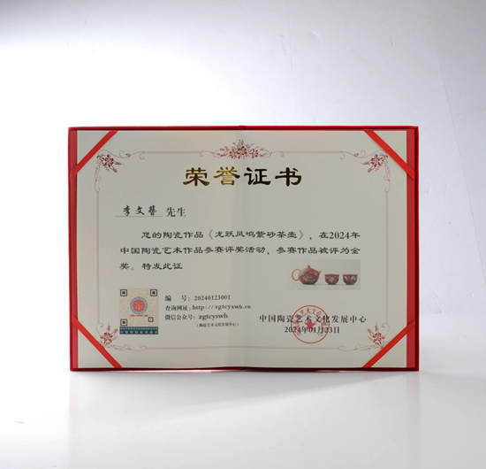 2024年作品《龍躍鳳鳴紫砂茶壺》榮獲北京中國陶瓷藝術名家作品展金獎