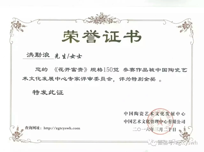 作品被江西省工藝美術(shù)館、景德鎮(zhèn)陶瓷館(國家二級(jí)博物館)收藏。2015年作品《綠地暗紋葫蘆瓶》被釣魚臺(tái)國賓館收藏。 受到李長春、劉云山、吳官正、丁關(guān)根,著名收藏家馬未都先生、中央電視CCTV-4《國寶檔案》專家唐愷、著名藝術(shù)品收藏家王剛、著名演員唐國強(qiáng)、著名導(dǎo)演張紀(jì)中等國家領(lǐng)導(dǎo)人和名人的好評(píng)與珍藏。
