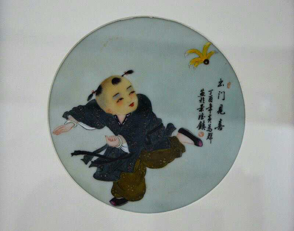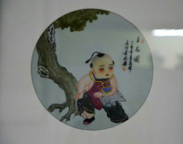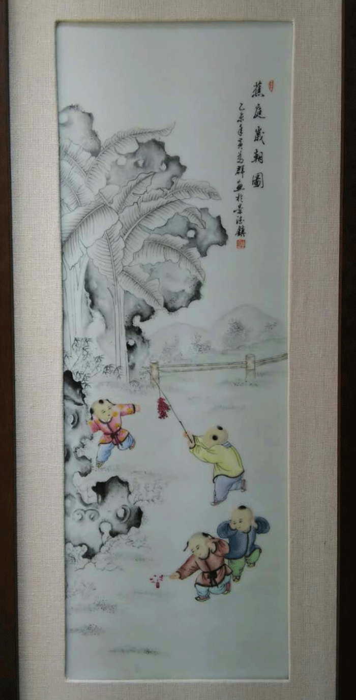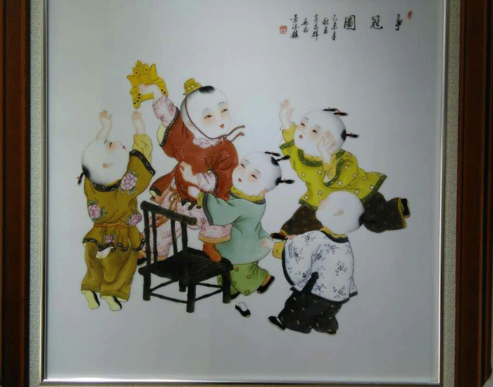 瓷板作品2013年江西省工藝美術(shù)“國瓷杯”陶瓷精品大賽榮獲“金獎”新彩“童子爭冠圖”鞍山市博物館永久收藏。