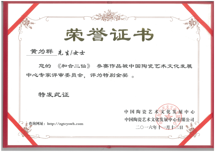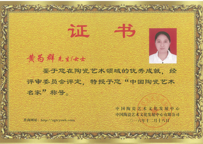 2016年經(jīng)中國陶瓷藝術(shù)文化發(fā)展中心評審委員會評定為“中國陶瓷藝術(shù)名家”。