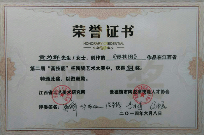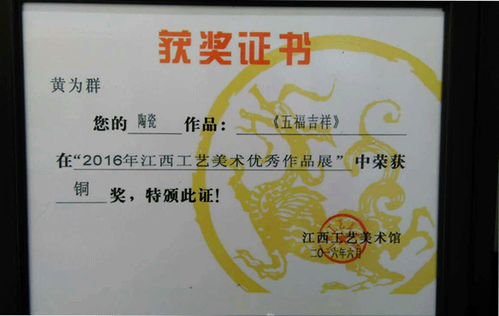 創(chuàng)作的《五福吉祥》在2016年江西工藝美術(shù)優(yōu)秀作品展中榮獲“銅獎”。并被江西工藝美術(shù)館收藏。 作品《釉上粉彩童子》經(jīng)中國陶瓷藝術(shù)文化發(fā)展中心評審委員會評定為“特別金獎”。