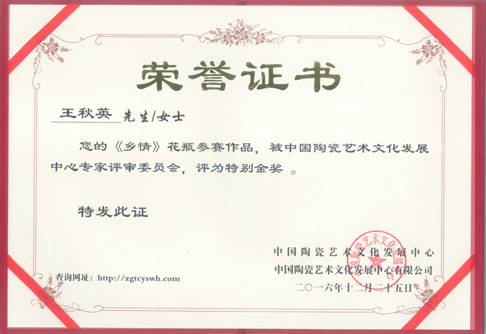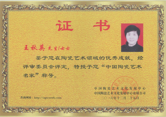 2016年經(jīng)中國陶瓷藝術(shù)文化發(fā)展中心評審委員會評定為“中國陶瓷藝術(shù)名家”。