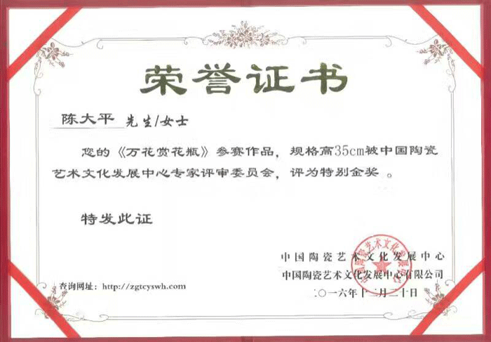 作品《萬花賞》經(jīng)中國陶瓷藝術(shù)文化發(fā)展中心評審委員會評定為“特別金獎”。