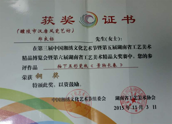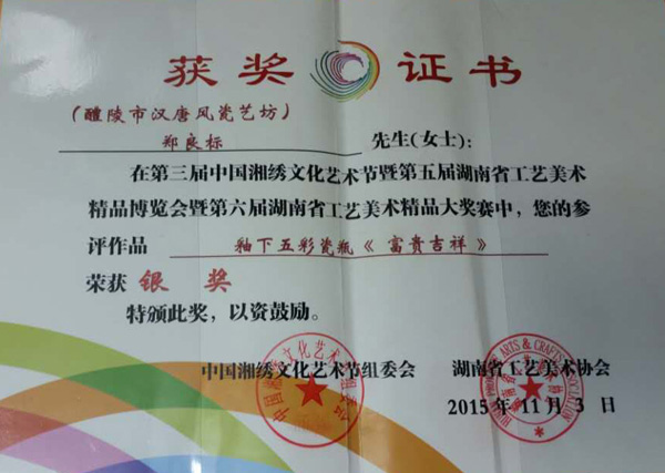 《富貴吉祥》瓶在第六屆湖南省工藝美術(shù)精品大獎賽中榮獲銀獎、