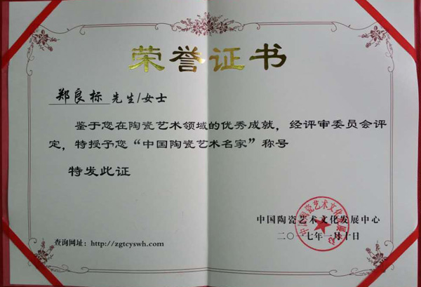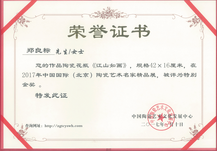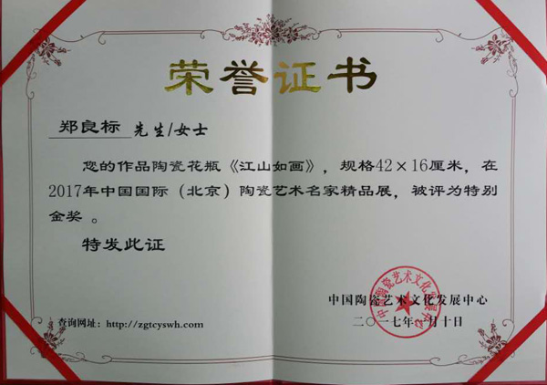 《江山如畫》瓶在2017年中國國際(北京)陶瓷藝術(shù)名家精品展中榮獲金獎;同時被中國陶瓷藝術(shù)文化發(fā)展中心授予“中國陶瓷藝術(shù)名家”榮譽稱號