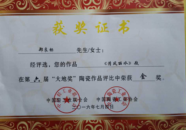 《清風(fēng)麗水》瓶在第六屆“大地獎”全國陶瓷作品評比中榮獲金獎;