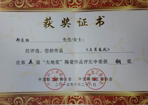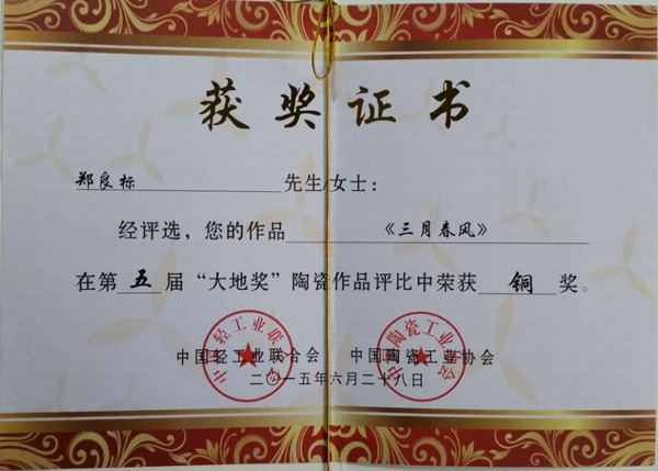 《三月春風(fēng)》瓶在第五屆“大地獎”全國陶瓷作品評比中榮獲銅獎;