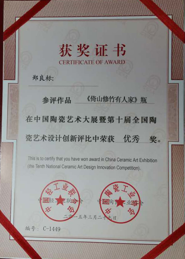 《倚山修竹有人家》瓶在第十屆全國陶瓷藝術(shù)設(shè)計創(chuàng)新評比中榮獲優(yōu)秀獎;